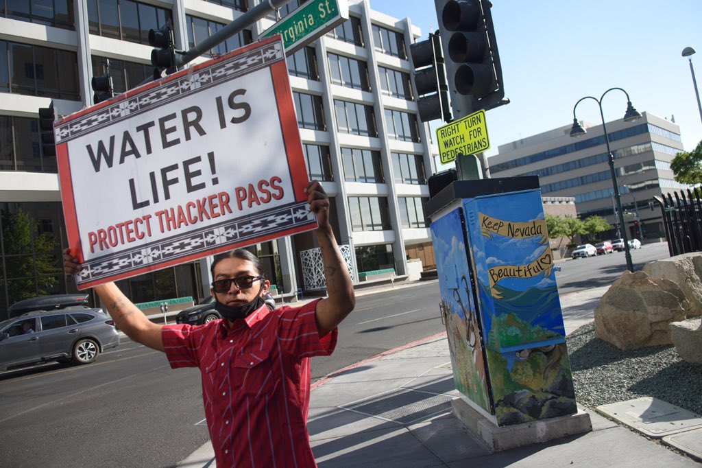 July 21, 2021, Protesters against the Lithium Americas Thacker Pass lithium mine gather outside the federal courthouse in Reno, Nevada, as a judge hears a motion against the project in a packed courtroom. Photo: David Calvert July 21, 2021 1024 × 682