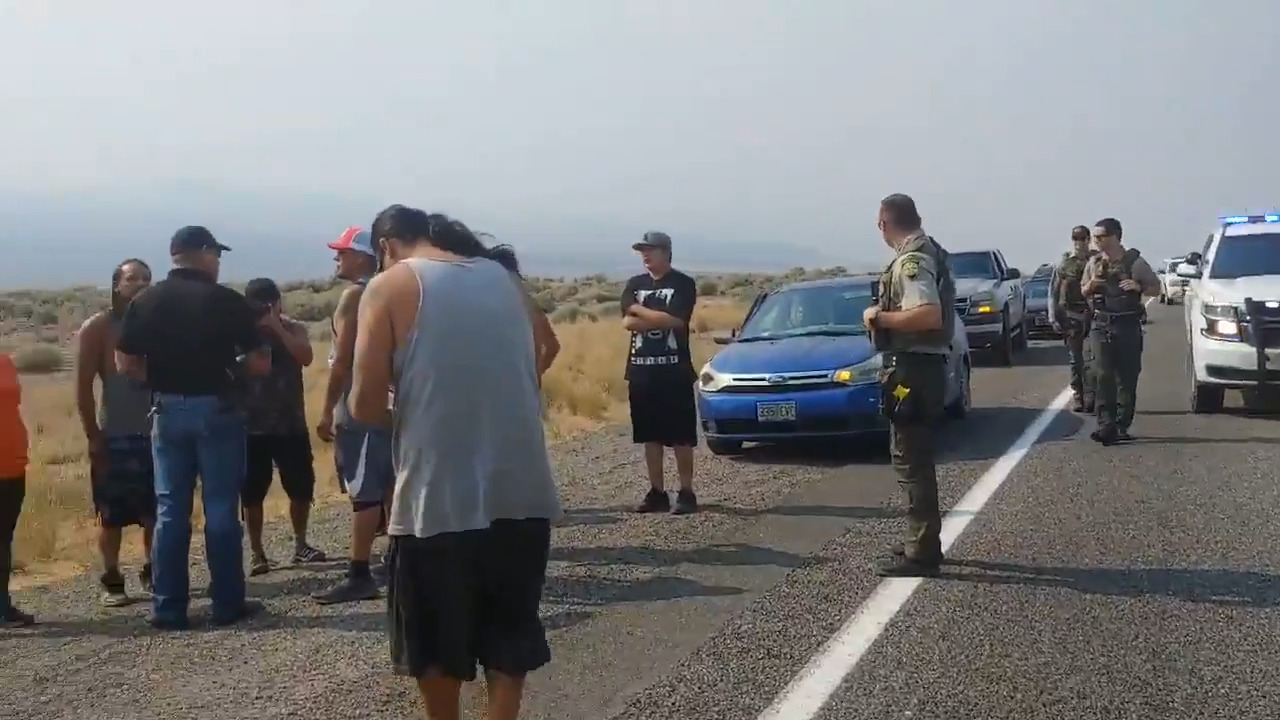 July 24, 2021, The People of Red Mountain fighting the Lithium Americas Thacker Pass lithium project held a prayer run from Winnemucca to Peehee Mu’huh, Thacker Pass, as a show of solidarity. Law enforcement agencies stopped the participants along the route at various times. Source: Cozca