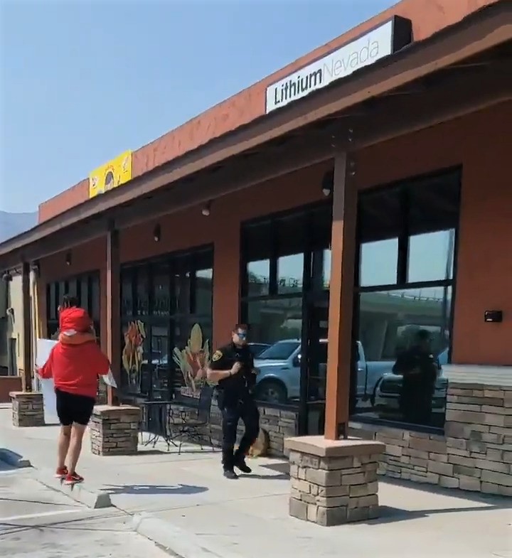 July 23, 2021, A small group of Indigenous peoples fighting the Lithium Americas Thacker Pass lithium project gathered to protest in front of the company office at 91 Melarkey St., Winnemucca. Police responded and there were no arrests. Source: Cozca