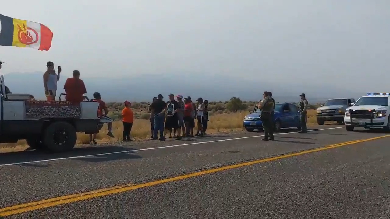 July 24, 2021, The People of Red Mountain fighting the Lithium Americas Thacker Pass lithium project held a prayer run from Winnemucca to Peehee Mu’huh, Thacker Pass, as a show of solidarity. Law enforcement agencies stopped the participants along the route at various times. Source: Cozca