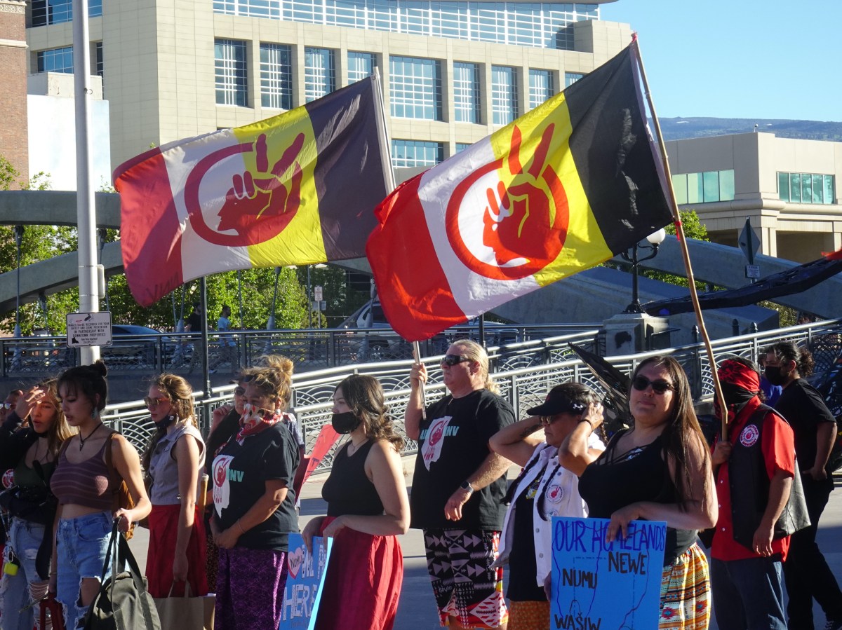 June 12, 2021, Hundreds of protesters gather at Believe Plaza, Reno, Nevada, for the Protect Peehee Mu’huh / Thacker Pass from the proposed Lithium Americas Thacker Pass open pit lithium project. The American Indian Movement, AIM, a group with goals of full restoration of tribal sovereignty by confrontation politics and AntiFash Reno, an Antifa linked organization, also supported the protest. Photo source: Our Town Reno.