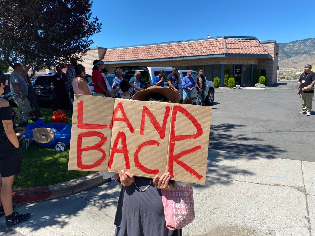 July 7, 2021, Indigenous peoples fighting the Lithium Americas Thacker Pass lithium project gathered in front of Far Western Anthropological Research Group, Carson City, Nevada. Lithium Americas hired Far Western to conduct digging and excavation for a cultural study on traditional Paiute and Shoshone lands. Reporting: Daniel Rothberg, Nevada Independent. Photo: David Calvert