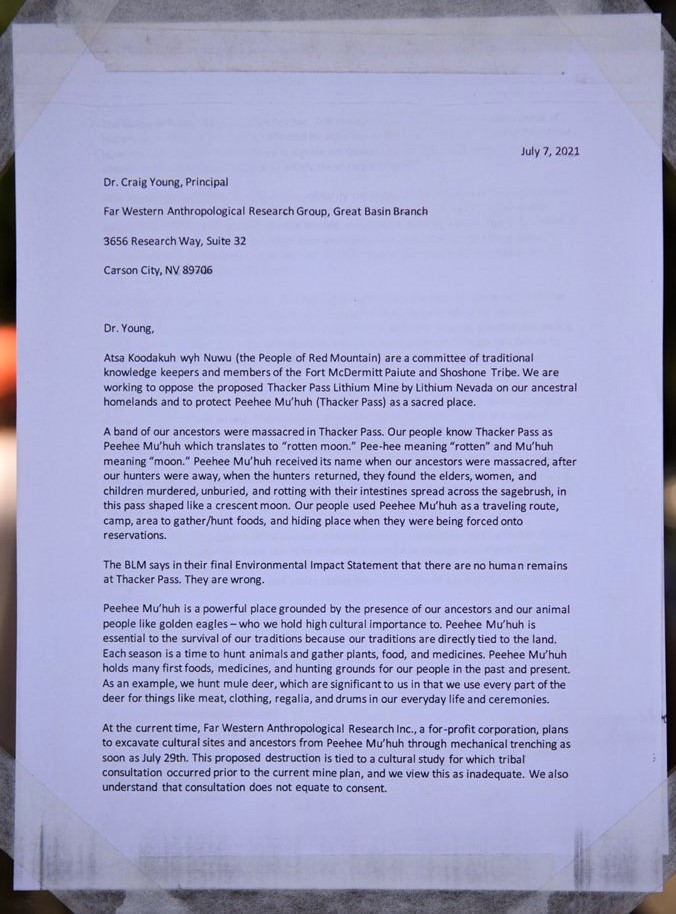 July 7, 2021, Indigenous peoples fighting the Lithium Americas Thacker Pass lithium project gathered in front of Far Western Anthropological Research Group, Carson City, Nevada. Lithium Americas hired Far Western to conduct digging and excavation for a cultural study on traditional Paiute and Shoshone lands. No one at Far Western Anthropological Research Group would talk to the protesters. The protesters taped a letter of concern to the office door. Reporting: Daniel Rothberg, Nevada Independent. Photo: David Calvert