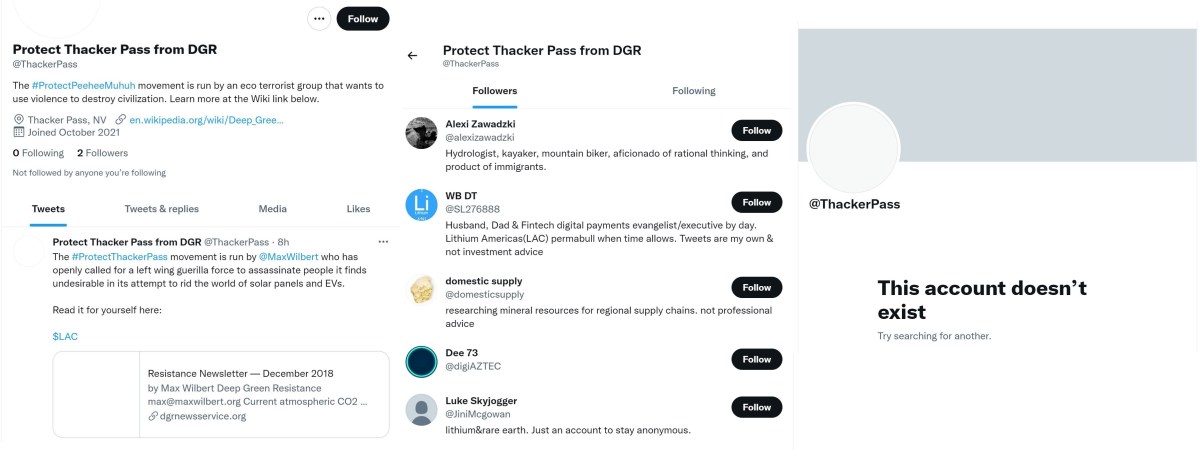 Oct. 6, 2021, A parody Twitter account was created in an apparent attempt to mock Native American and environmental groups protesting the Lithium Americas Thacker Pass project. Investors and at least one Lithium Americas executive used the account. Hours later the account was deleted.