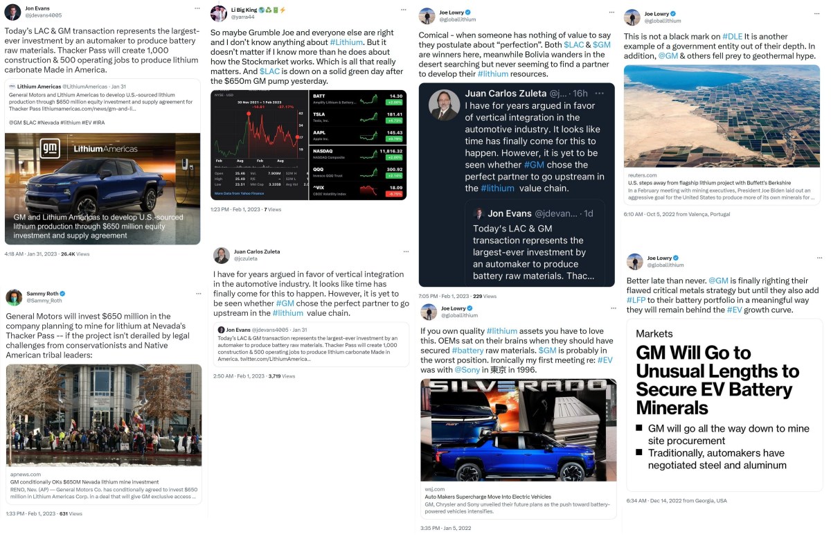 Feb. 1, 2023, Comments posted on Twitter after the announcement that General Motors will invest in the Lithium Americas Thacker Pass mine and previous comments on General Motors sourcing lithium. Source Twitter February 1, 2023 3597 × 2335