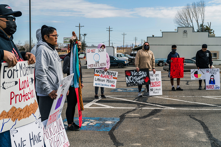 March 18, 2021, Members of the Fort McDermitt Paiute and Shoshone Tribe protest outside the BLM office in Winnemucca, Nevada, before beginning a prayer run to Lithium Americas proposed Thacker Pass lithium mine. Source Forbes India. May 8, 2021 900 × 600