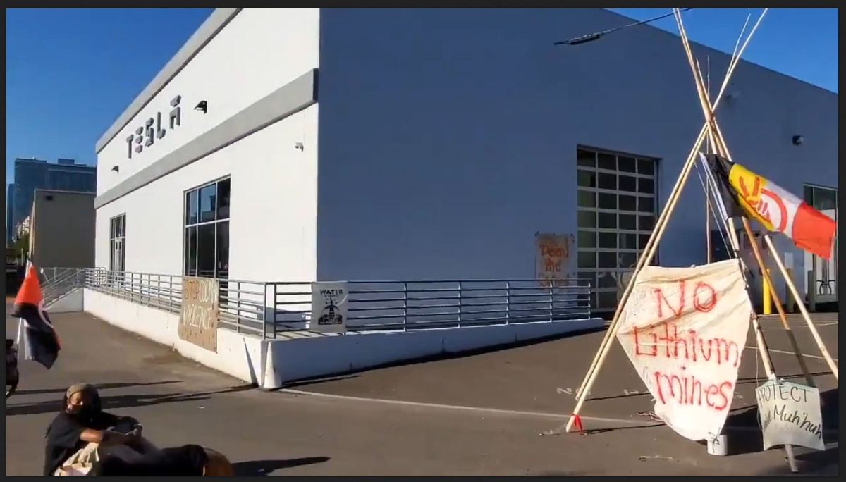 July 7, 2021, Following the protest at Far Western Anthropological Research Group, Carson City, Nevada, Portland Antifa group RisingPDX called for a Protect Thacker Pass solidarity rally at the Tesla facility in Portland, Oregon. Protesters erected a symbolic tipi with banners and the American Indian Movement flag. Photo: Cozca