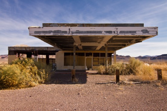 I have spent a good amount of the day walking around Bonnie Claire on two occasions. I also travel US Hwy. 95 often while exploring the desert. And each time I drive through this part of the desert I can clearly see the Bonnie Claire mill up on the side of the hill and the abandoned gas station still stands as a shell to its former purpose. On my last trip past the gas station I saw that the gas tank with the artwork was gone. It was probably hauled away for scrap.