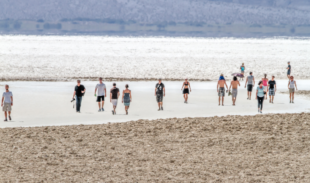 In the extreme heat of the summer, tourists are drawn to walk out on the salt flats at Badwater in the lowest point in North America. Extremely high heat waves radiating off the ground give people an undulating look from a distance.
