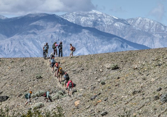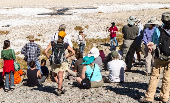 Death Valley National Park is also a huge outdoor laboratory for scientists. Here scientists holding an active research permit look for samples for a presentation about geomicrobiology to a group of event participants at the lowest point in North America.