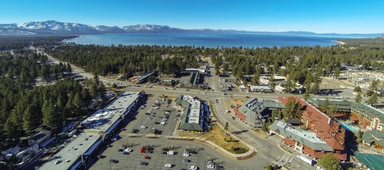 Aerial view of Heavenly Village, South Lake Tahoe, CA and the casinos at Stateline, NV for another article on the California drought and lack of snow at Lake Tahoe.