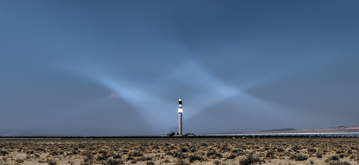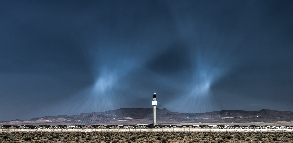 Solar flux is easily visible against the dark sky at the Crescent Dunes Solar Energy Project near Tonopah, Nevada.