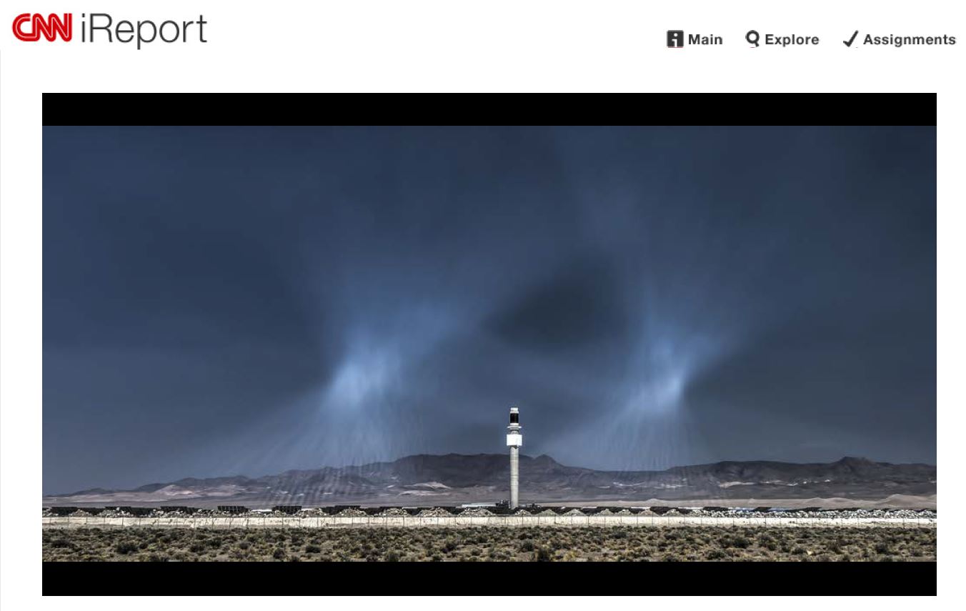 Solar flux, also referred to as concentrated solar energy, usually occurs during testing when multiple heliostat mirrors are aimed at a stand-by position and not focused on the receiver tower.