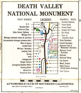 The only remaining maps to check for possible telephone labels were maps of the Death Valley area. Death Valley maps from 1972 through 2004 were checked. The map legends provided the standard information and included things like mines, ranger stations, roadside rests, gas stations, emergency radiator water, drinking water, springs, wells, water sources that required purification before drinking, places to get meals and snacks but not one mention in the legend or a label on the map of a telephone.