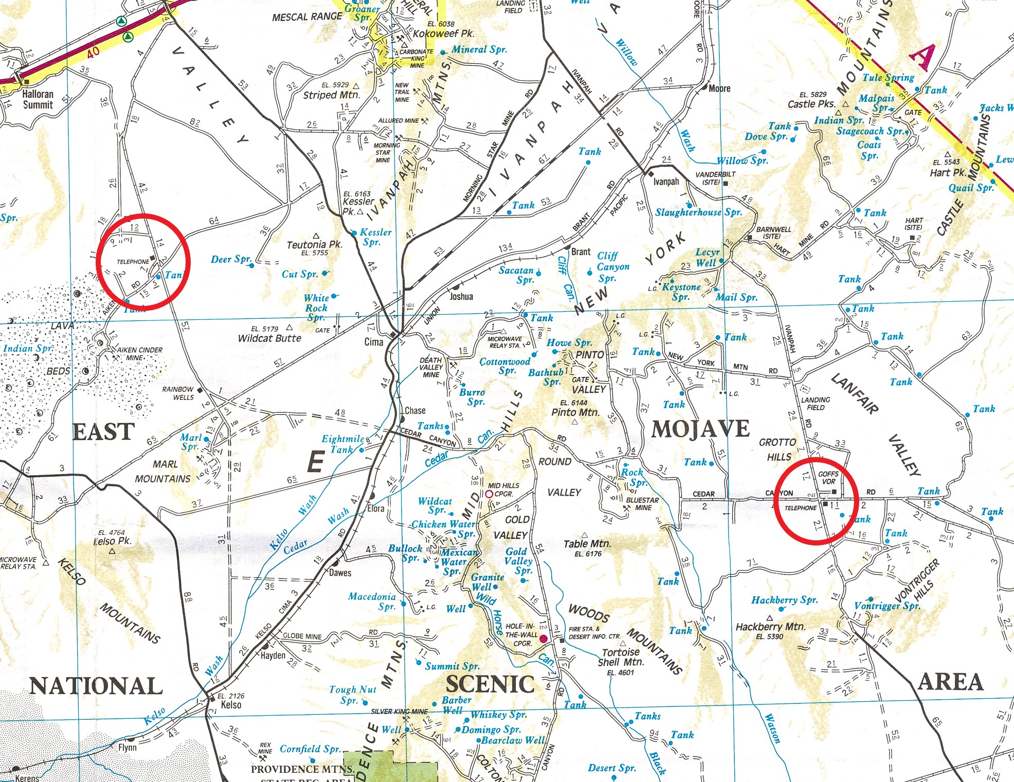 Detailed checks of the San Bernardino County maps from 1965 through 2013 show that the only two telephones labeled on the map were the Mojave Phone Booth and Lanfair #1.
