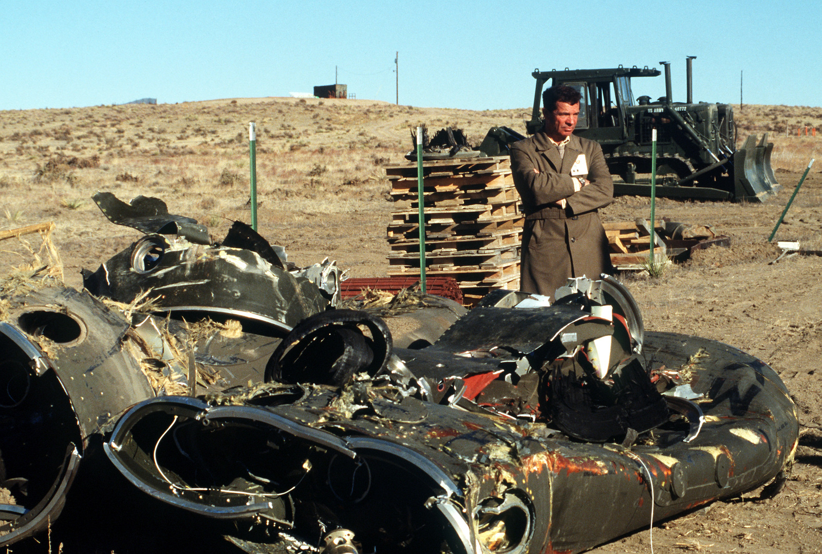 DF-ST-91-05787 June 14, 2020 1600 × 1078 in Russian Inspection Station A Soviet inspector stands beside the mangled remnants of two Pershing II missile stages. Several missiles are being destroyed in the presence of Soviet inspectors in accordance with the Intermediate-Range Nuclear Forces (INF) Treaty.