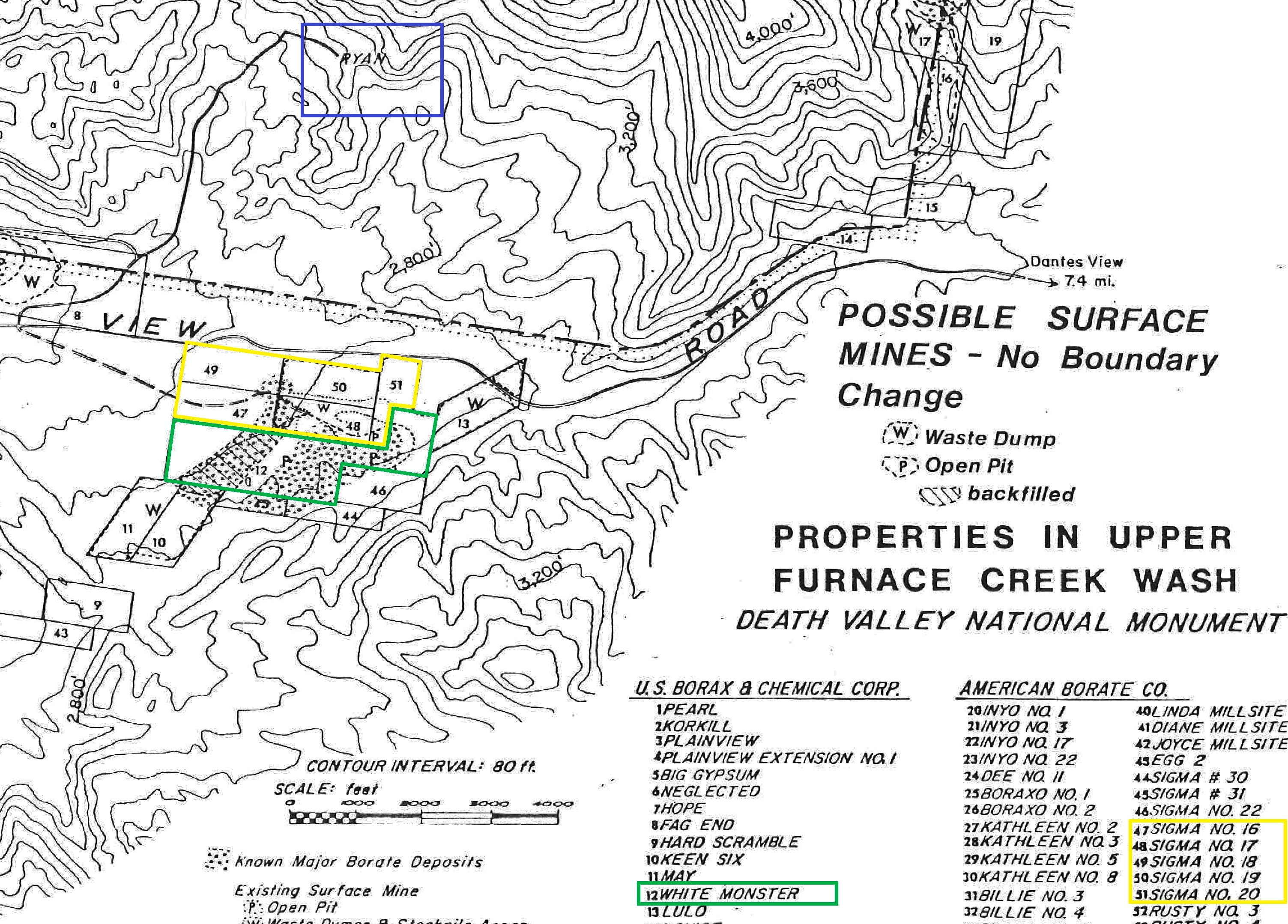 By mid afternoon on the same day, John Stark with Death Valley National Park, sent an email to park staff noting that the White Monster claim and ore deposit is in the park near the old Sigma open pit mine. Stark added that there is still a lot of ore at the White Monster claim and that Superintendent Reynolds may have wanted some way to prevent mining there in the future.